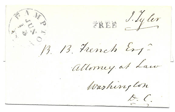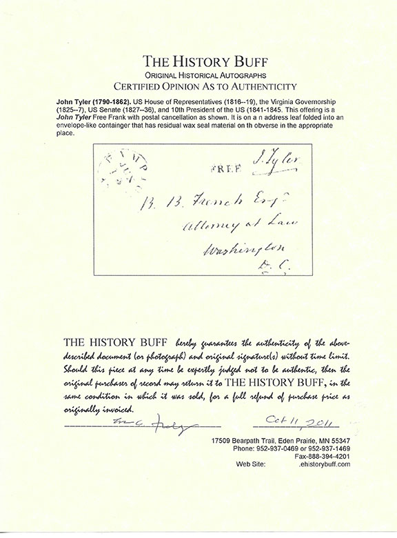 TYLER, John (1790-1862) Member of the US House of Representatives (1816-1819), the Virginia Governorship (1825-1827), US Senate (1827-1836), and the 10th President of the US (1841-1845). Free Frank on a folded panel, hand addressed by Tyler to B.B. French Esq. Attorney at law Washington DC. Postal cancellation “Hampton NY June 13.” Signed J. Tyler with a “Free” stamp to the left of his name. Nice clean cover. Together with a COA from The History Buff.................$950.00 |