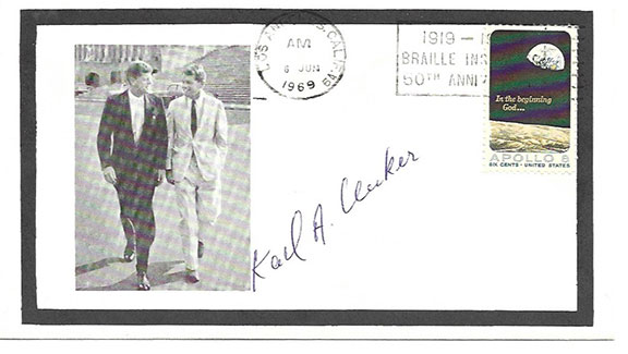 EUCKER, Karl A Maitre d’ of the Hotel Ambassador who led the way and walked Robert Kennedy through the kitchen of the hotel while holding on to the right wrist of RFK. Along with RFK he also had hold of Ethel Kennedy. Eucker was dressed in a tuxedo and saw Sirhan who looked to be just another bus boy who wanted to shake the hand of Kennedy. Eucker watched Sirhan pushing forward and stopped his movement. Sirhan pulled a revolver from his pants and opened fire, After the second shot Eucker pushed Sirhan’s hand which held the gun and pinned him against the steam table. Black bordered cover with a cachet of JFK and RFK walking together, Apollo 8 stamp cancelled Los Angeles June 6, 1969. Fine scarce signature of Karl A. Eucker in a clear area of the cover. Not a common autograph. In fine condition...............$75.00