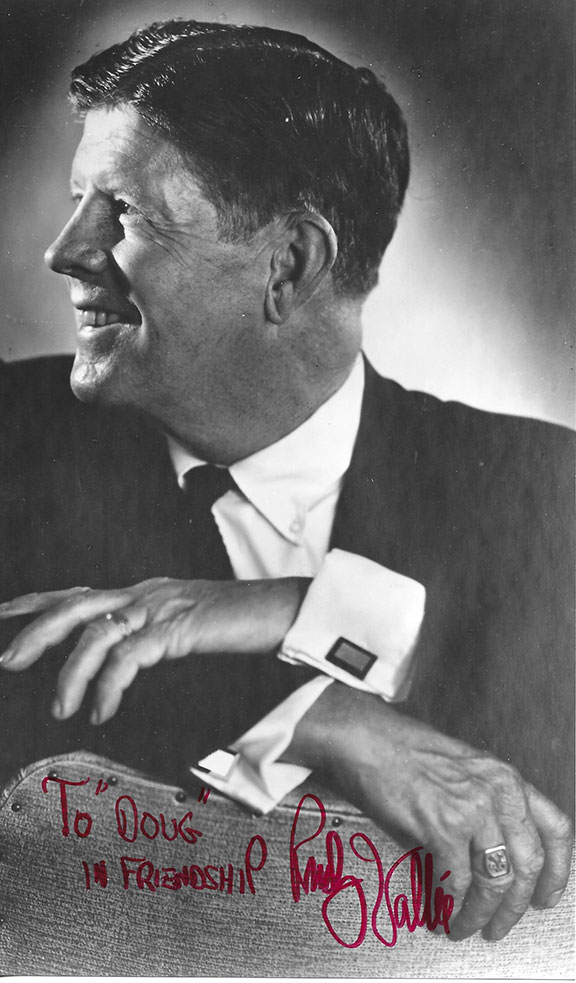VALLEE, Rudy (1901-1986). Bandleader, crooner whose voice made ladies’ knees weak during the 1920’s and 30’s. In his earlier movies he played a romantic lead. He had an explosive ego driven personality that made it difficult to work with him. Attractive photograph, B&W, 6.5”X9”, head and solders pose looking to his side. Inscribed in red ink: “To Doug in Friendship Rudy Vallee.”......$47.50 |
