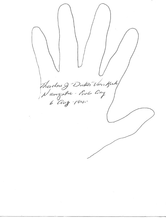 VAN KIRK, Theodore (1921-2014) Navigator on the Enola Gay. The last crew member to survive. On an 8.5” sheet, Van Kirk has traced his hand. This is the hand that got the Enola Gay to Hiroshima and back safely. Van Kirk has written: “Theodore J.“Dutch” Van Kirk, Navigator-Enola Gay, 6 Aug. 1945.” In very fine condition...........$95.00![]() |