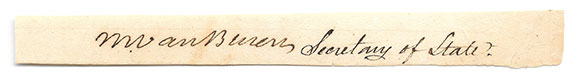 VAN BUREN, Martin (1782-1862). Eighth President of the United States. Fabulous signature as Secretary of State. Slip measures seven inches long.................SOLD