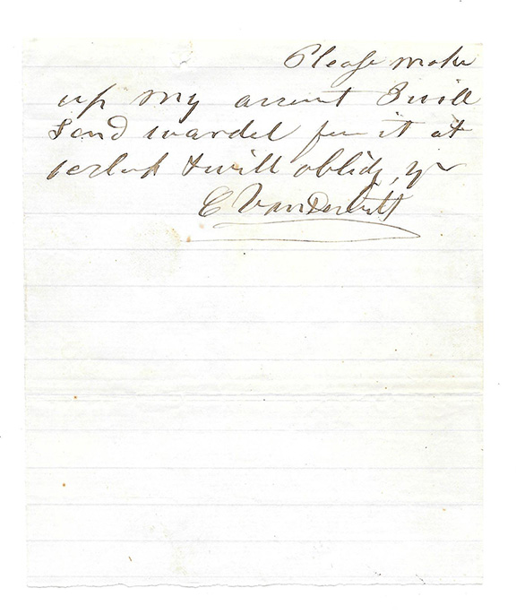 VANDERBILT, Cornelius (1794-1877). American financier and businessman. Founder of the family fortune, known as the “Commodore,” Rare autograph note signed “C. Vanderbilt,” one page, no date, 4”x5” on lined paper. Vanderbilt writes: “Please make up my account I will send Wardel for it at 6 o’clock & will oblige you. C. Vanderbilt.” In fine condition...............SOLD