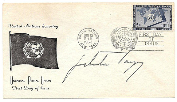 VARGAS, Getulio (1882-1954). Brazilian Political leader and President. He governed as provisional president until his election in 1934. Vargas ruled Brazil from 1932-1945. In October 1945 the people staged a revolution which forced his resignation. In 1950, he ran for president once again and was elected. His was inaugurated on January 31, 1951 and his term was for five years. During August 1954, the Air Force and Army Generals demanded his resignation. Vargas took a leave of absence on August 24, 1954 and committed suicide in his bedroom in the palace on that same day. First Day cover commemorating the First Day of Issue of the United Nations postage stamp. Postmarked, United Nations, June 12, 1953, New York. Vargas has hand signed this cover with a wonderful large full signature. An impressive item......$235.00
