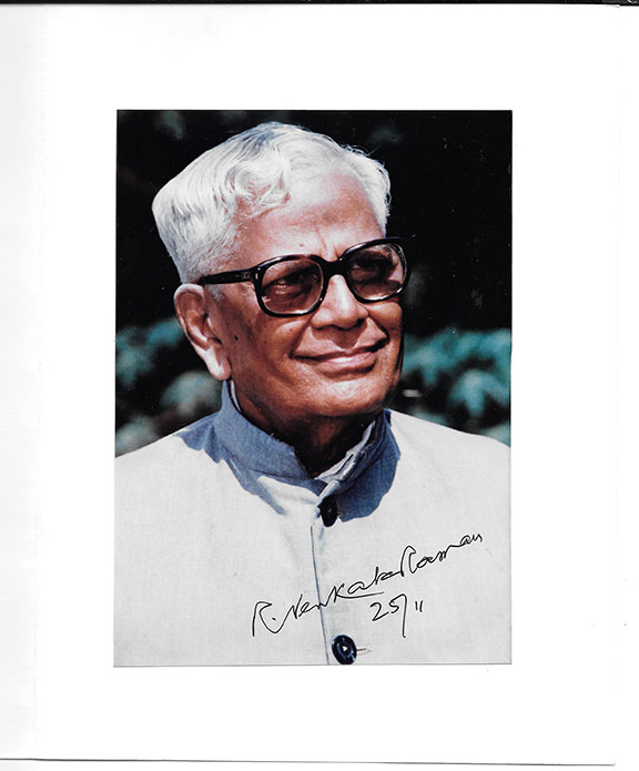 VENKATARAMAN, Ramaswamy (1910-2009). Lawyer, Indian independence activist and 8th President of India (1987-1992). Wonderful color photograph, 5”x7”, head and shoulders pose, contained in the official presentation folder of the president, Republic of India. The photograph is boldly signed. In very fine condition...............$150.00
