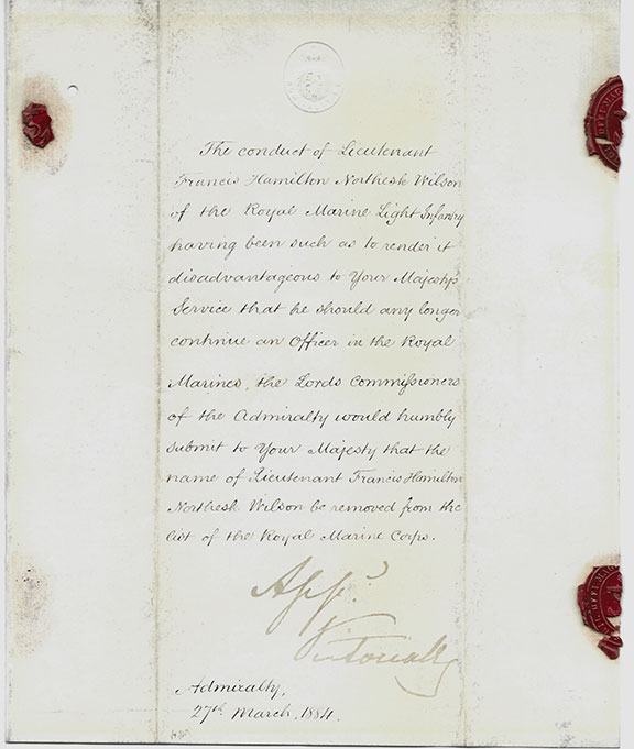 VICTORIA, QUEEN (1819-1901). Queen of Great Britain and Ireland; Empress of India. The longest reigning English Monarch. She gave her name to an age. Document signed. One page, on the embossed stationary of The Admiralty, 27 March 1884 is written in part: “...The conduct of Lieutenant Francis Hamilton Northesk Wilson of the Royal Marine Light Infantry having been such as to render it disadvantageous to your Majestys Service that he should any longer continue an officer in the Royal Marines....would humbly submit to your Majesty that the name of Lieutenant Francis Hamilton Northesk Wilson be removed from the list of the Royal Marine Corps.” In the Queen’s hand she writes ‘App(roved)’ Victoria R.” Together with a fine postcard portrait of the Queen. In V/G condition with half of two red wax seals intact. A nice pair for framing.................$475.00