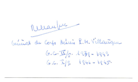 VILLACEQUE, Pierre ( -2002) French fighter pilot WWII. Credited with 6 victories. Choice signature on a 3”x5’’ card and also listing his accomplishments. Uncommon...................................$49.00