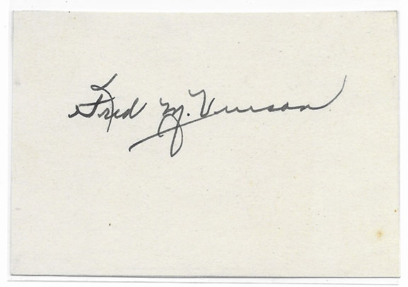 VINSON, Fred M (1890-1953). Served as the 13th Chief Justice of the U.S. Supreme Court from 1946 until his death. Of the very few Americans to serve in all three branches of the U.S. Government. Choice bold full signature on a 2.5”x3.5” card.....................$95.00![]() |
