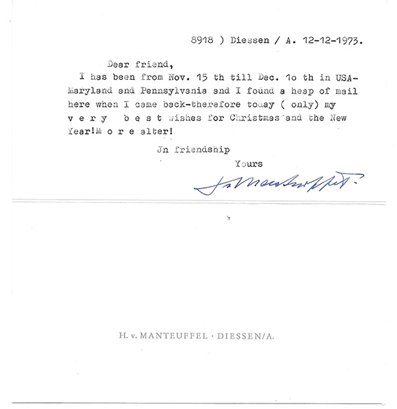 VON MANTEUFFEL, Hasso (1897-1980). One of Rommel’s top Panzer generals who commanded the 5th Panzer Division on the Western Front and the third in the last desperate stand on the Eastern Front. Known as the “The Panzer baron” he was decorated with the RK with Diamonds. He led his armor into the Moscow suburbs and he was the outstanding German leader in the “Battle of the Bulge”. Christmas/New Years Greeting Card bearing his typewritten message dated 12-12-1973. He writes that he was in the USA in Maryland and Pennsylvania and he found a heap of mail when he cam back...sends best wishes for Christmas and the New Year. Excellent ink signature. Together with the original stamped envelope to a Las Vegas collector. Affixed to the back of the envelope is Von Manteuffel’s return name and address sticker....................SOLD