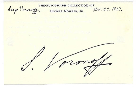Russian Physician Known For Grafting Animal Glands on Human Beings VORONOFF, Serge (1866-1951). Russian physician who worked in Paris. Director of Laboratory of Experimental Surgery. He is known for his research and grafting of animal glands on human beings for rejuvenation. Uncommon signature of a card from a noted autograph collection. Identified by the collector as “Serge Voronoff. Nov. 29, 1927.” A wonderful, bold autograph on a 3”x4” slip......$125.00 |