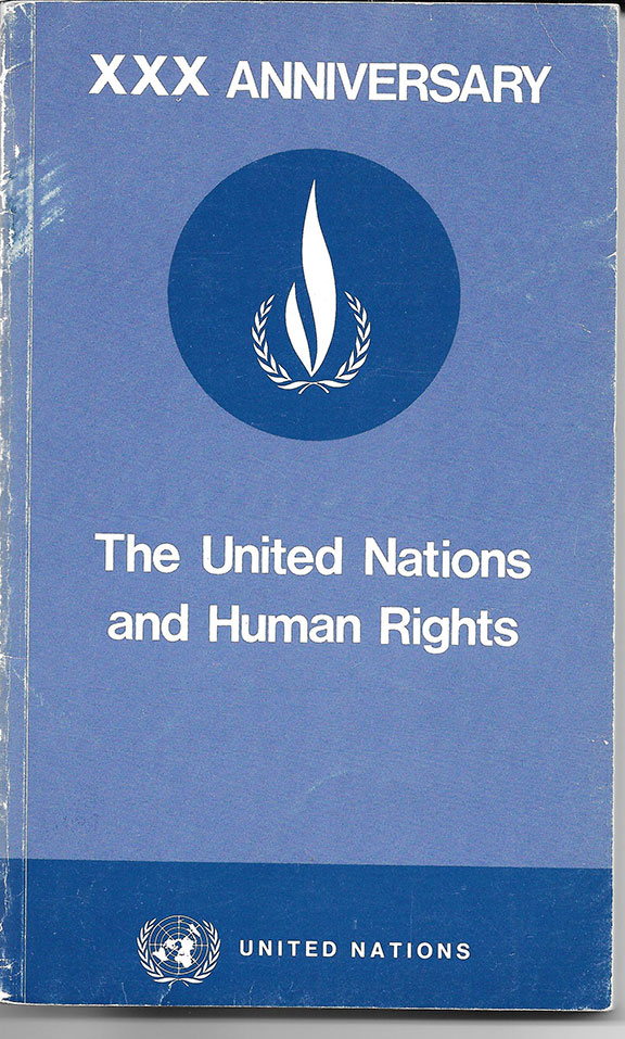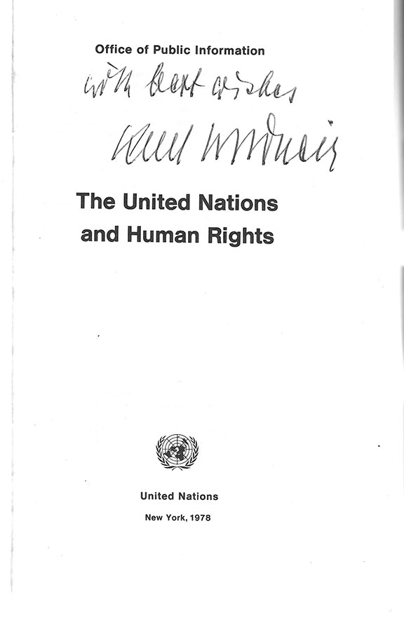 WALDHEIM, Kurt (1918-2007). Ninth President of Austria (1986-1992). Fourth Secretary General of the United Nations (1972-81). He was an intelligence officer for the Wehrmacht during WWII. Later this raised International controversy. The book: The United nations and Human Rights. Office of Public Relations, United Nations, new York, 1978. Kurt Waldheim, Secretary General. One hundred sixty-six pages, soft cover. Inscribed with a three word sentiment by Kurt Waldheim. Very uncommon in this form...............$95.00