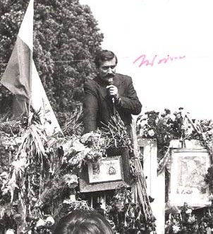 4 in. by 6 in., speaking at a rally. Signed, "Walesa"