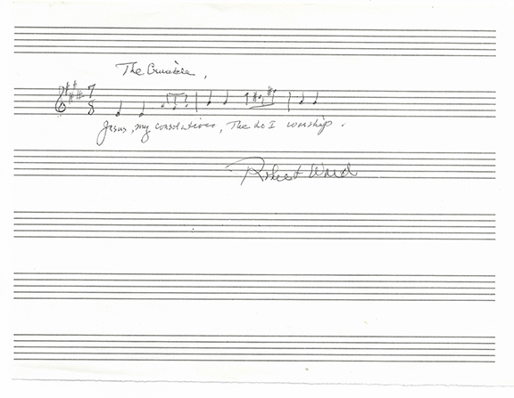 Scarce AMQS from The Crucible WARD, Robert (1917-2013) American composer, best remembered for his English language opera “The Crucible.” This opera was based on the 1953 play by Arthur Miller. The play won both the 1962 Pulitzer Prize for Music and the New York Music Critics Circle Citation. This play was inspired by the McCarthy witch hunt of the 1950’s. The Crucible was one of the most performed operas by an American composer. Three bars of music from The Crucible where the composer has also written the famous words from the opera: “Jesus, my consolation, The do I worship.” and signed in full by Robert Ward. This is the first music we have handled from The Crucible. In excellent condition.........$225.00