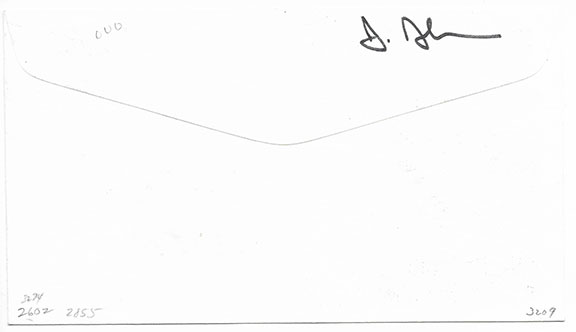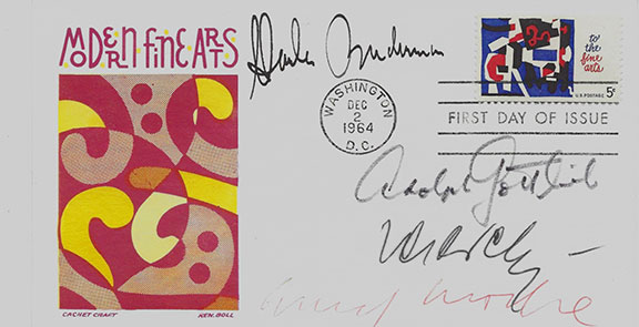 WARHOL, Andy (1928-1987). American visual artist, leading figure in the Pop Art movement. JOHNS, Jasper (1930- ) American painter associated with abstract expressionism. VARSELY, Victor (1906-1997). Hungarian/French artist called “grandfather” and leading figure of the Op Art movement. GOTTLEIB, Adolf (1903-1974). American abstract expressionist painter. One of the first generation of abstract expressionists. He held 56 solo exhibitions. BIEDERMAN, Charles (1906-2004) American artist, pioneer in American Modernism. Self-proclaimed “best-known unknown artist in America.” Choice First Day of Issue cover of the “ Modern Fine Arts” U.S. 5 cent postage stamp. Nice cachet of a work of Fine Arts. Stamp cancelled Washington, D.C. December 2, 1964. Signed by four of the artists on the face of the cover. Uncommon, early full ink signature of Andy Warhol. On the verso Jasper Johns has signed his name. A very scarce combination of signatures on one item....$475.00 ![]() ![]() |