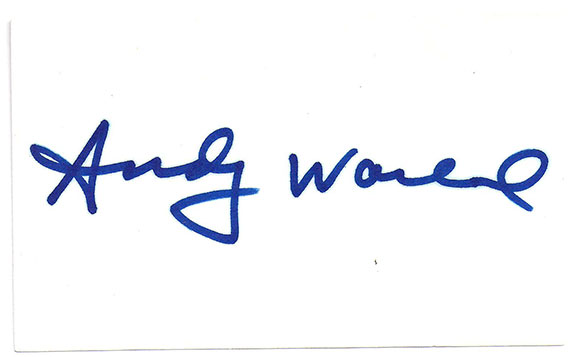 WARHOL, Andy (1928-1987). Leading American artist in the area known as Pop Art. A fabulous “in person” full signature boldly signed using a blue Sharpie Pen, on a 3”x5” card. As nice a signature of Warhol that can be expected. Not the usual very rushed version................................................. SOLD |