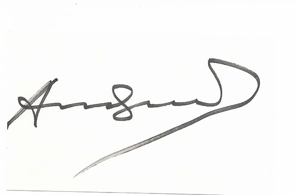 WARHOL, Andy (1928-1987) Andy Warhol was born Andrew Warhola in Pittsburgh, Pennsylvania, in 1928. In 1945 he entered the Carnegie Institute of Technology (now Carnegie Mellon University). Upon graduation, Warhol moved to New York where he found steady work as a commercial artist working for several magazines including Vogue, Harper’s Bazaar and The New Yorker. The 1960s was an extremely prolific decade for Andy. He created many paintings that remain icons of 20th-century art, such as the Campbell’s Soup Cans, Disasters and Marilyn’s. At the start of the 1970s Andy Warhol began publishing Interview magazine and renewed his focus on painting. Works created in this decade include Mao’s, Skulls, Hammer and Sickles, Torsos and Shadows and many commissioned portraits. Firmly established as a major 20th-century artist and international celebrity, Andy Warhol exhibited his work extensively in museums and galleries around the world. Very scarce 3”x5” card bearing a wonderful genuine signature of Andy Warhol. Out of 156 items listed on eBay of Warhol, only one 3”x5” card is available at $925 and it is a poorly attempted forgery. Of the 156 items signed by Warhol listed on eBay only 31 appear to be genuinely signed. Beware of the many limited edition prints of 200 copies signed by Warhol. They are not hand signed and are listed at auction starting at 99 cents or selling for $149.00. None contain genuine hand signed signatures. Our 3”x5” has a signature that measures a whopping 4.75” long. In choice condition.......................$475.00