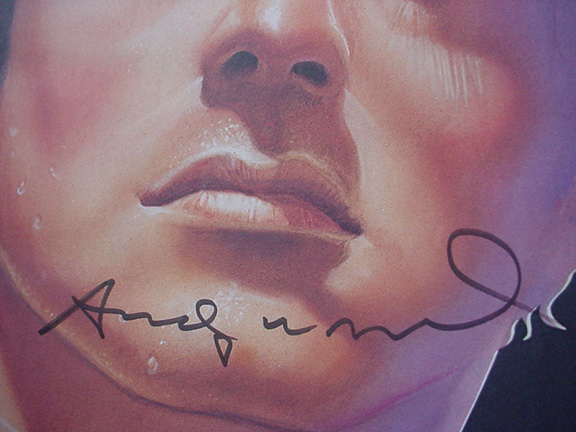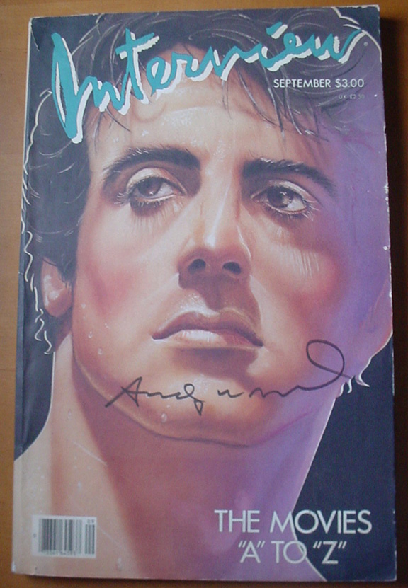 WARHOL, Andy (1928-1987). American artist, leading figure in the visual art movement known as Pop Art. Founder if Interview magazine which is nicknamed “The Crystal ball of Pop”. Interview magazine, September 1985, Movies A-Z/Sylvester Stallone. Very large magazine, 11”x17” in remarkably good condition. Andy Warhol has boldly signed his name across the front cover. His signature is magnificent and measures eight inches long..........................SOLD