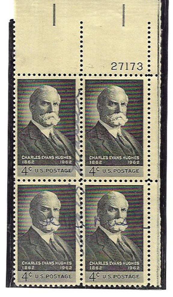 WARREN, Earl (1891-1974) Chief Justice of the U.S. Supreme Court, Governor of California. He headed the official investigation into the assassination of President John F. Kennedy. RUSK, Dean (1909-1994). U.S. Secretary of State (1961-1969). Defended the U.S. involvement in Viet Nam. Plate block of four U.S. 4 cent Charles Evans Hughes stamps signed by both Warren and Rusk. Most unusual and in very fine condition....................$85.00 ![]() |