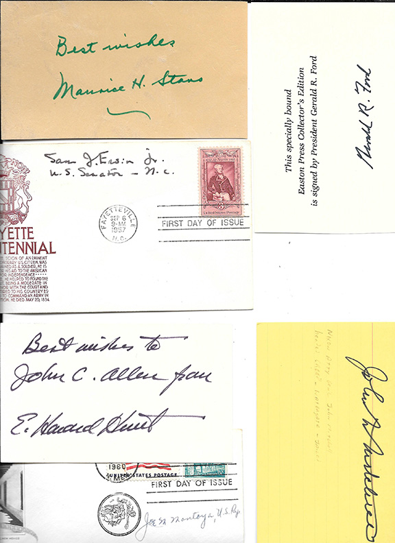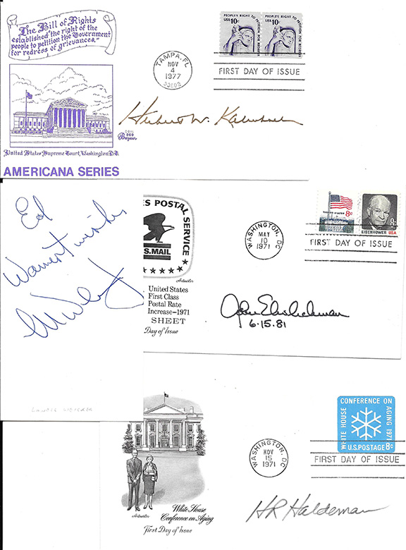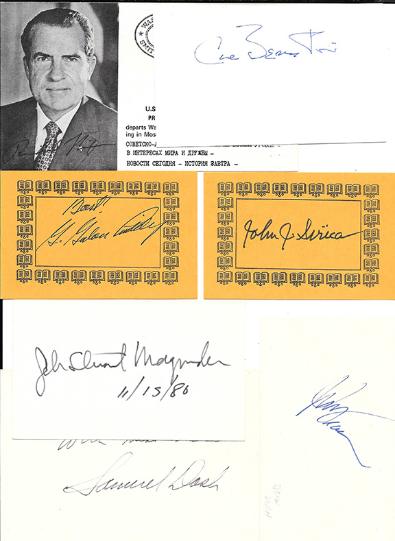 WATERGATE SCANDAL. Outstanding collection of many of the major players of the criminal act of breaking in and bugging the Democratic National Headquarters in Washington, D.C. regarding the 1972 Presidential campaign. Signatures of Richard Nixon, on his portrait on a cover, President who faced impeachment for his part in the cover-up and first President to resign, Gerald R. Ford, Nixon’s successor, pardoned Nixon, signature on a partial page from a limited edition signed book, Carl Bernstein, journalist, investigator who broke the scandal, G. Gordon Liddy, former F.B.I. Agent, convicted of conspiracy, burglary and illegal wiretapping, fine signature and sentiment on a bookplate, Jeb Stuart Magruder, Director of White House Communication, pleaded guilty of conspiracy, wonderful signature and date on a 3”x5”card, James D. St. Clair and his wife Billie N. St. Clair, James was Special Counsel to President Nixon, James St. Clair and his wife have both signed a First Day Cover, John J, Sirica, Presiding Judge of the Watergate Trials, fabulous signature on a bookplate, James Dean, counsel to President Nixon, fine signature on a 3”x5” card, Herbert W. Kalmbroch, personal attorney to Nixon, fine signature on a First Day Cover, Lowell Weicker, U.S. Senator from Connecticut, served on the Senate Watergate Committee, Samuel Dash, Special Counsel to the Watergate Committee, his important and decisive questions helped bring out some of the cover-up and lies at the hearing, fine signature, inscribed along with a sentiment on a large index card, Joe M. Montoya, U.S. Senator from New Mexico, member of Senate Watergate Committee, signature on a First Day Cover, John S. Ehrlichman, chief domestic affairs advisor under Nixon, convicted of conspiracy, obstruction of justice and perjury, signature and date (6.15.81) on a First Day Cover, H.R. Halderman, White House Chief of Staff, convicted of conspiracy, obstruction and three counts of perjury, Maurice Stans, Nixon’s Secretary of Commerce, in charge of the finances of the re-election committee, wonderful signature and two word sentiment on a slip, Sam J. Ervin, Senator from North Carolina, Chairman of the Senate Watergate Committee, fine signature adding “U.S. Senator-N.C.), E. Howard Hunt, Former C.I.A. Agent and White House Consultant, convicted Watergate conspirator, fabulous full signature inscribed and signed on a 3”x5” card, John W. Mitchell, Nixon’s Attorney General who left the post to head the Re-election Committee, convicted and sent to jail, wonderful signature on a 3”x5” card. A fine and substantial Watergate related collection consisting of many of the major players.........................SOLD