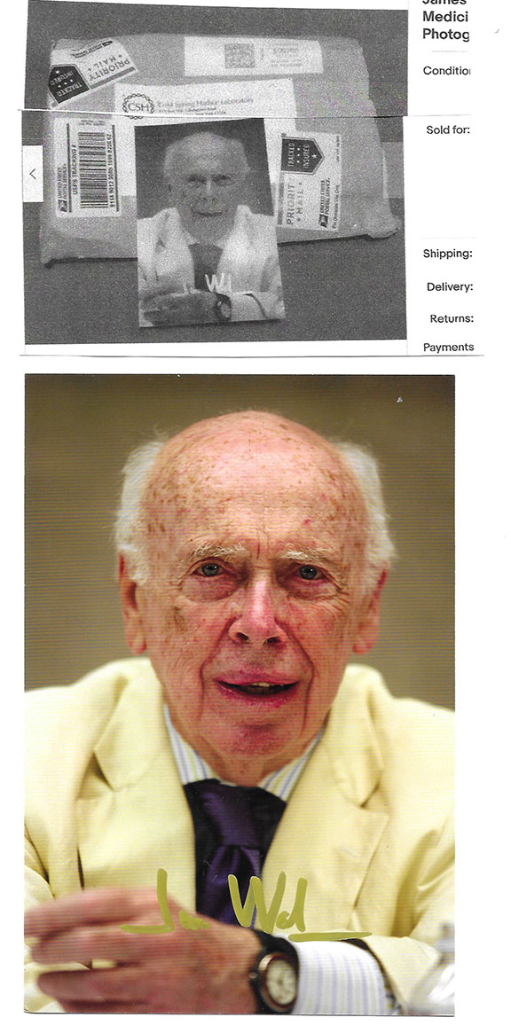 WATSON, James D. (1928- ) American molecular biologist, geneticist and zoologist. Co-discovered the structure of DNA in 1953. Awarded the Nobel Prize in 1962. He was eventually shunned by the scientific community and in need of money. His Nobel Prize Gold Medal was the first to be sold by a living recipient. It fetched 4.1 million dollars at auction. Scarce color photograph, head & shoulders pose, looking directly into the camera. Appx. 4”x6” signed using a wide tip gold ink pen. His signature is the largest and finest we have ever handled.......................$275.00