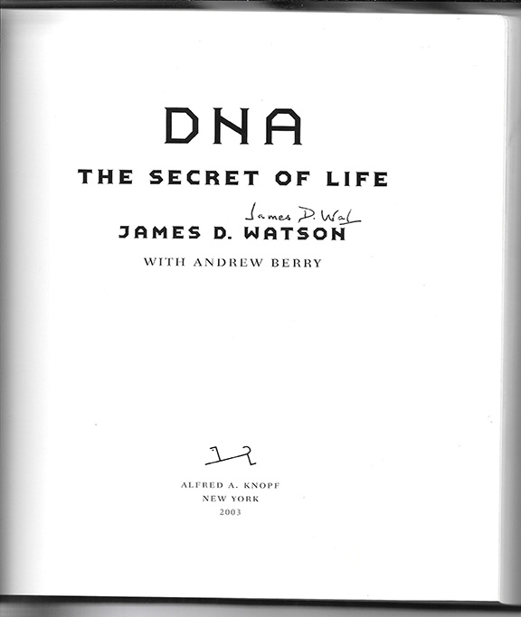 WATSON, James D. (1928- ) American molecular biologist, geneticist and Zoologist. He co-discovered the structure of DNA in 1953. Awarded the Nobel Prize in Medicine in 1962. His book: “DNA, The Secret of Life”. Alfred A. Knopf New York, 2003, First Edition so stated. Four hundred forty-eight pages, illustrated. Signed by James D. Watson on the title page. Book and dust jacket in fine condition. RARE..............................$495.00