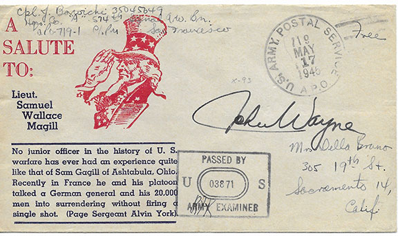 WAYNE, John (1907-1979). American actor, director, and producer. Scarce U.S. Army postal cover with a cachet of Uncle Sam. Rubber stamp that this cover was passed by an Army Examiner and written “Free” in lieu of a postage stamp. Cancelled U.S. Army Postal Service A.P.O. May 17, 1945. Boldly signed with a vintage signature of John Wayne. World War II was officially over a week earlier. Most unusual and in V/G condition.....................$775.00![]() |