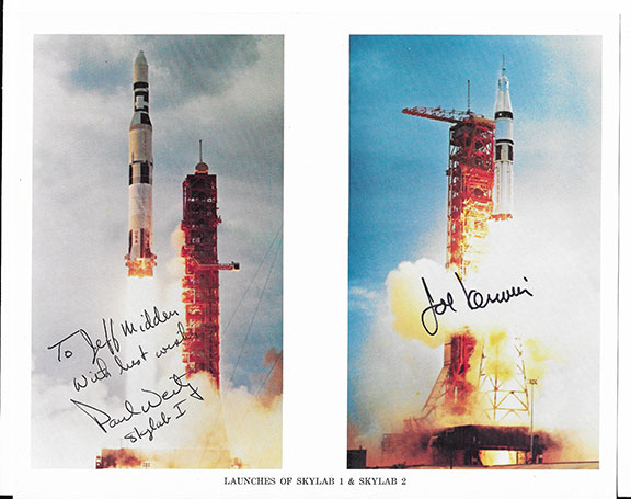 WEITZ, Paul (1932-2017). NASA astronaut who flew into space twice. He was on the first crewed Skylab mission. He was also commander of the STS-6, the maiden flight of the space shuttle Challenger. KERWIN, Joe (1932- ). Science pilot for Skylab 2 mission during 1973. Official NASA color photograph of the launches of Skylab 1 & 2, Inscribed and signed by Paul Weitz adding “Skylab 1” in his hand. Also signed by Joe Kerwin. In excellent condition................................$160.00 ![]() |