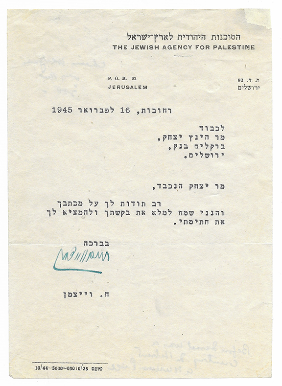 Typed Letter signed (in Hebrew letters): "C. Weizmann" , 1 page, 5x7. Jerusalem, 1945, February 16. On letterhead of the Jewish Agency for Palestine to Mr. Heinz Yitzchak of the Jewish Agency for Palestine. In Hebrew, translated in full: “...Many thanks to you for your letter and I am happy to comply with your request,,,.in blessings....’’ . Chaim Weizmann (in Hebrew). One small paper repair to top right corner, otherwise in fine condition.................$1350.00
