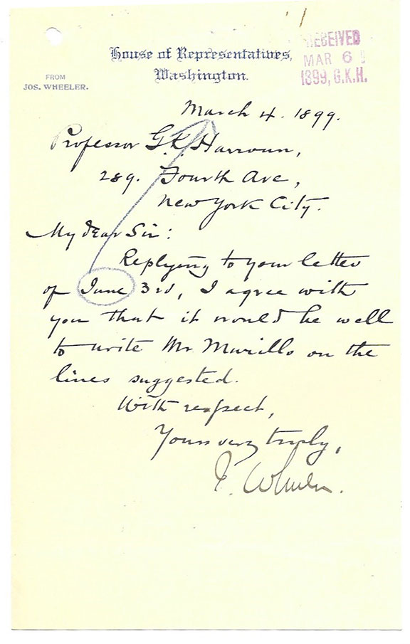 WHEELER, Major General Joseph (1836-1906). Graduate of the West Point United States Military Academy. He was a Southern Confederate Officer in the war between the states. Chief of the Army of the Mississippi, Cavalry Commander who had over a dozen horses shot out from under him. He was called “Fighting Joe Wheeler.” He was one of the generals that took a great part in the Spanish-American War. He was a member of Congress for nearly 20 years. Wheeler was the only general who could wear the grey uniform of the South and the blue uniform of the U.S. Republic. Autographed letter signed on the letterhead of the House of Representatives, Washington, March 4, 1899. One page to professor G.K. Harroun, New York City. Wheeler writes in part: “...I agree with you that it would be well to write Mr. Murillo on the lines suggested...” Signed J. Wheeler. One file hole top left corner otherwise in very good condition................SOLD