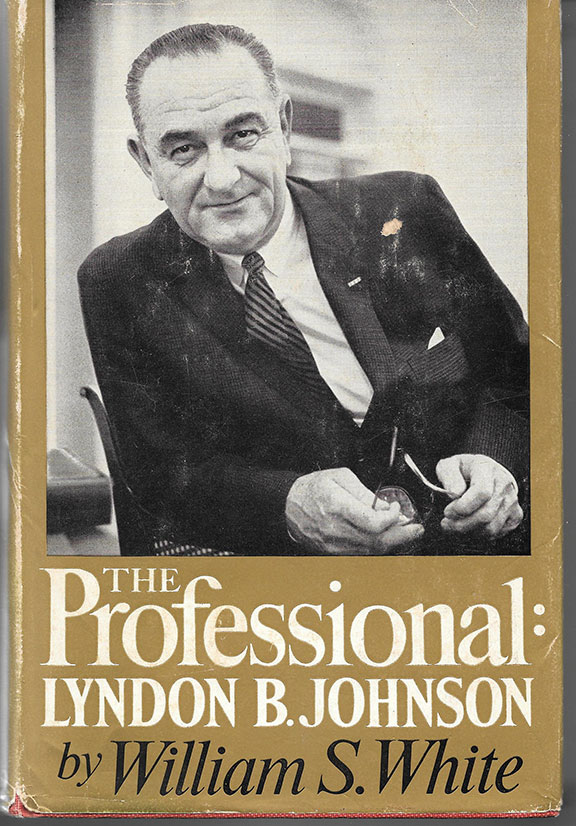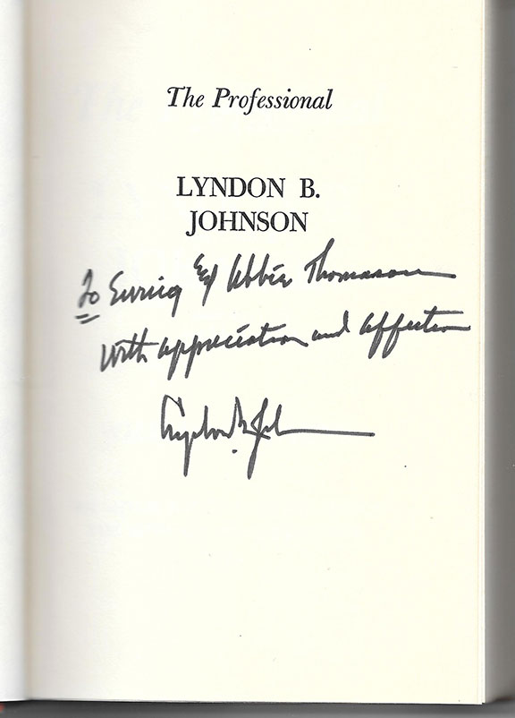 WHITE, William S.  “The Professional Lyndon B. Johnson.”  Houghton Mifflin Co. 1964. First Edition, First printing. Two hundred seventy-three pages.  Fine copy with the dust jacket.  The very scarce first edition which contains a very scarce presentation inscription by Lyndon B. Johnson.  Very few of this title bears a GENUINE inscription/signature of Johnson.  Most all were signed by his secretary while Johnson was President..................................$395.00