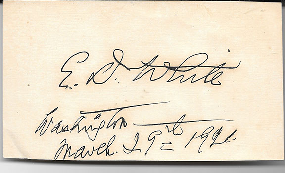 WHITE, Edward D. (1845-May 19, 1921). Associate Justice of the U.S. Supreme Court, Promoted to Chief Justice. He held this position from 1910 to 1921. Fabulous signature on a large card adding “Washington March 29, 1921” by his hand. Signed as Chief Justice and just several weeks before his death. Not a common signature............ $175.00