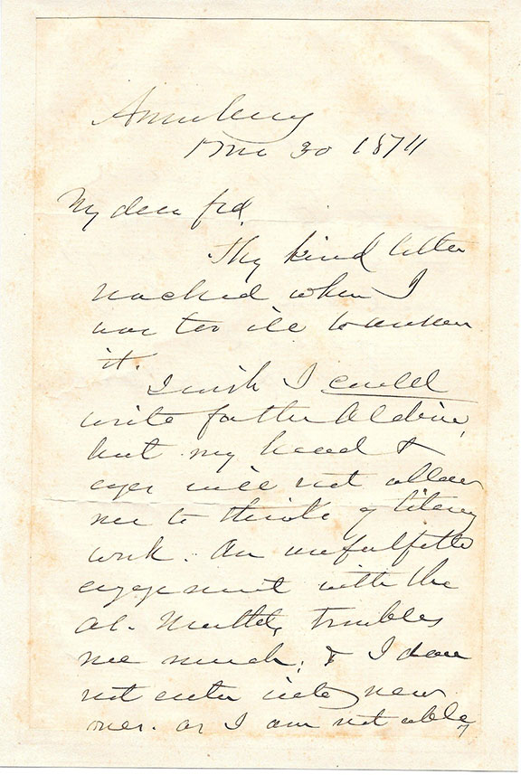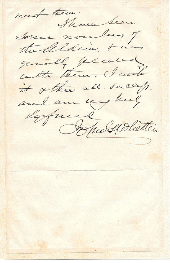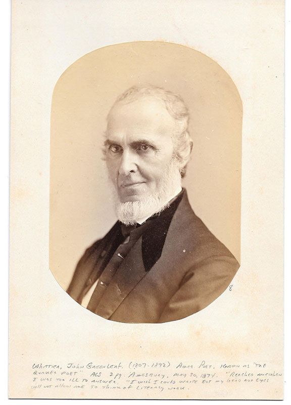 WHITTIER, John Greenleaf (1807-1892). American poet. Autograph letter signed. Two pages, Amesbury, Mar. 30, 1874. He writes in part: “The kind letter reached when I was too ill to act on it. I wish I could write for the Aldine but my head and eyes will not allow me to think of literary work... ” Inlaid otherwise a fine example. Together with an original cabinet photograph. A fine combination.......$375.00![]() ![]() |