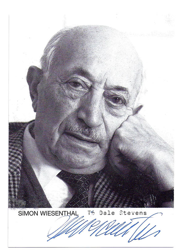 WIESENTHAL, Simon (1908-2005).  Austrian Jewish holocaust survivor. Famous hunter of the Nazi’s post WWII.  Photograph, 4”x6”, B&W, head & shoulders pose looking directly into the camera. Typed inscription, boldly signed on the lower white margin....................