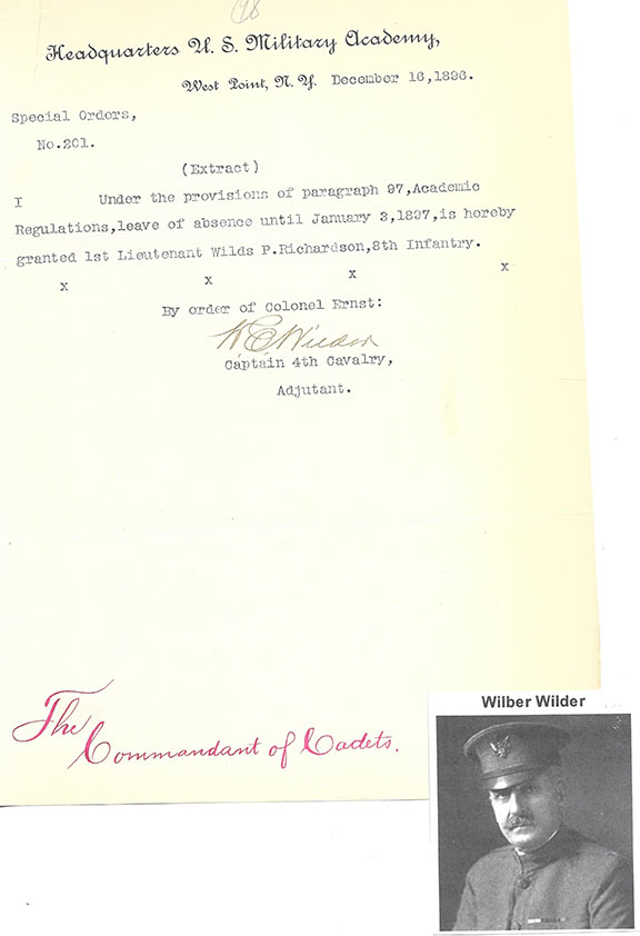 WILDER, Wilber Elliott (1857-1952). U.S. Army Brigadier General, Recipient of the Medal of Honor while with the 4th Cavalry for the retrieving of a wounded soldier under heavy fire at Horseshoe Canyon, NM on April 23, 1882. He participated in the Indian Wars, the Spanish-American War, the Pancho Villa Expedition and WW1. In 1886, Wilder was a key figure in negotiating the surrender of the Apache chief Geronimo. Rare, typed document signed, one-page, West Point, N.Y. December 16,1896 on the letterhead. Headquarters U.S. Military Academy, The Commandant of Cadets. Special Orders NO.201. “I Under the provisions of paragraph 97, Academic Regulations, leave of absence until January 3, 1897, is hereby granted 1st Lieutenant Wilds P. Richardson, 8TH Infantry.” By order of Colonel Ernst. W.E. Wilder, Captain 4th Cavalry, Adjutant.” In very good/fine condition..................................$135.00
