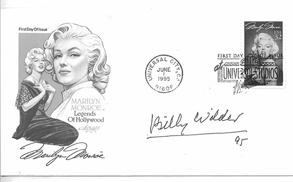 WILDER, Billy (1906-2001) Legendary Hollywood film director. His films include Some Like It Hot, Lost Weekend, The Apartment, Double Indemnity and Sunset Boulevard. FDC Honoring Marilyn Monroe. Nice cachet of Marilyn Monroe along with her printed signature. Affixed is a 32 cent US Marilyn Monroe postage stamp cancelled First Day of Issue, Universal Studios, Universal City, CA June 1, 1995. Hand signed and dated “Billy Wilder 95.” In very fine condition.....................SOLD![]() |