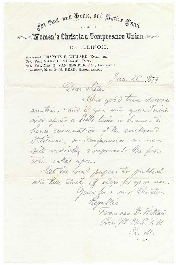 WILLARD, Frances E. (1839-1898). American reformer; devoted her life to the Temperance Movement. Helped organize the Prohibition Party (1892). Early autograph letter signed, one page, as President of the Women’s Christian Temperance Union. Written on their ornate letterhead, Illinois, Jan.25,1879. To Dear Sister.” In part: “One good turn deserves another, and if you and your friends will spend a little time in house-to-house circulation of the enclosed Petitions, WE temperance women will cordially reciprocate the favor…..Yours for a more Christiaan Republic, Frances E. Willard.” Fine condition ..............$350.00