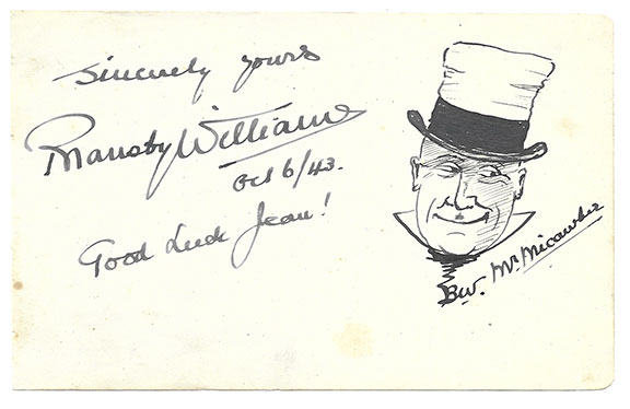 WILLIAMS, Bransby (1870-1961).  Actor who appeared in several movies including “Scrooge” (1928). Comedian and author. On an album page he writes a presentation inscription and two-word sentiment dated Oct.6/43. On the right side of the page he draws an ink sketch of the fictional Charles dickens character Mr. Micawber and signs the sketch with his “BW” initials.  Mr. Micawber was a clerk in Charles Dickens novel David Copperfield (1849-50). In fine condition.....$125.00
