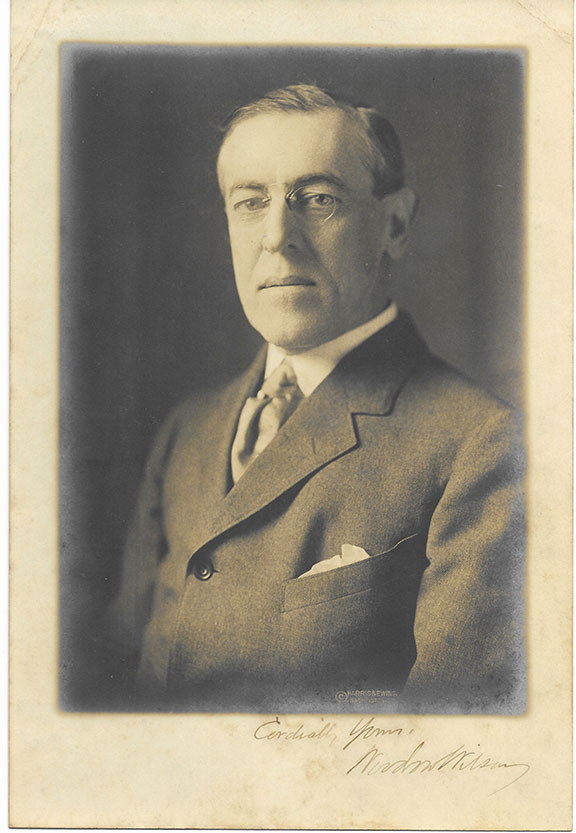 WILSON, Woodrow (1856-1924). The 28th President of the United States (1913-1921). The $100,000 bill bears Wilson’s portrait. Wilson was the recipient of the Nobel Peace Prize (1920) for ending WWI and for creating the League of Nations. Harris & Ewing Washington photograph, measures 8”x11” head and shoulders pose looking serious. A two-word sentiment and signature, undoubtedly as President, is at the lower light margin: “Cordially yours, Woodrow Wilson.” Somewhat uncommon in uninscribed photographs. In V/G condition.......$695.00