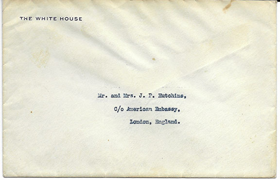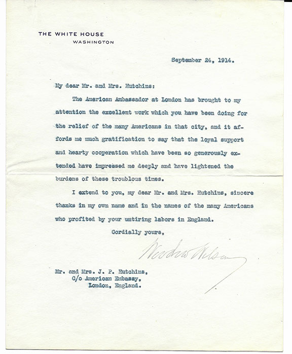 WILSON, Woodrow (1856-1924). The 28th President of the United States (1913-1921). The $100,000 bill bears Wilson’s portrait. Wilson was the recipient of the Nobel Peace Prize (1920) for ending WWI and for creating the League of Nations. Typed letter signed, one page on the imprinted stationery of The White House. September 24, 1914. To Mr. & Mrs. J.P. Hutchins c/o American Embassy, London, England. Wilson writes: “The American Ambassador at London has brought to my attention the excellent work which you have been doing for the relief of the many Americans in that city, and it affords me much gratification to say that the loyal support and hearty cooperation which have been so generously extended have impressed me deeply and have lightened the burdens of these troublous times. I extend to you, my dear Mr. & Mrs. Hutchins, sincere thanks in my own name and in the names of the many Americans who profited by your untiring labors in England...” Signed with a fine ink signature. On August 3rd Great Britain declared war on Germany. On August 4, Wilson issued a proclamation of neutrality as the war breaks out in Europe. In fine condition with original envelope..........$850.00
