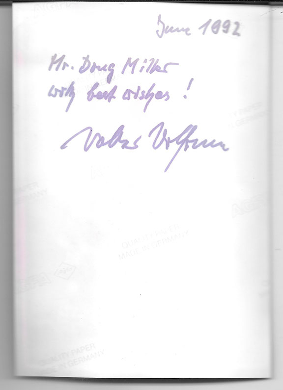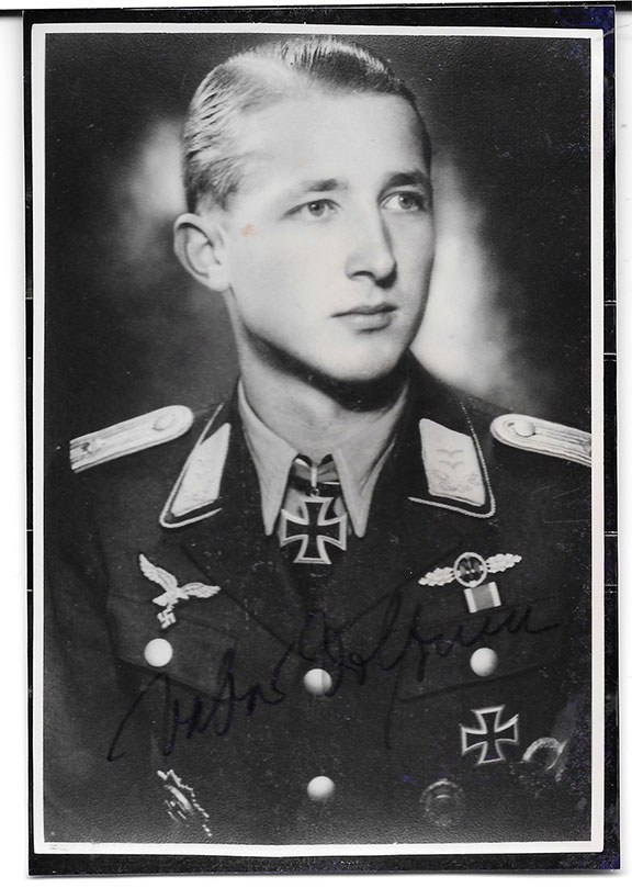 WOLFRUM, Walter (1923-2010). German fighter pilot. One of the top scoring fighter pilots in the Luftwaffe. Credited with 137 victories. Wonderful photograph, black & white, 4”z6”of the young looking Ace dressed in uniform. Boldly signed with good contrast. Short autograph note signed on the verso........... $95.00 |