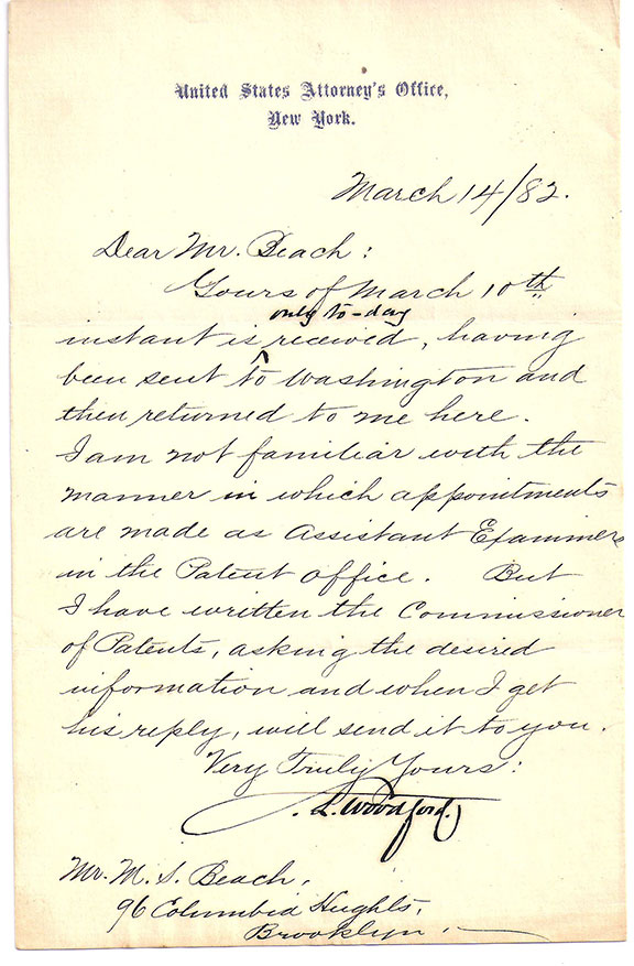 WOODFORD, Stewart L. (1835-1913). Bvt. Brig. General, Union Army. Military Governor of Charleston.. Letter signed, one page, 3/14/82 on the letterhead of the United States Attorney’s office. Fine lengthy letter regarding appointments at the patent office. A very nice example...................... $85.00 |