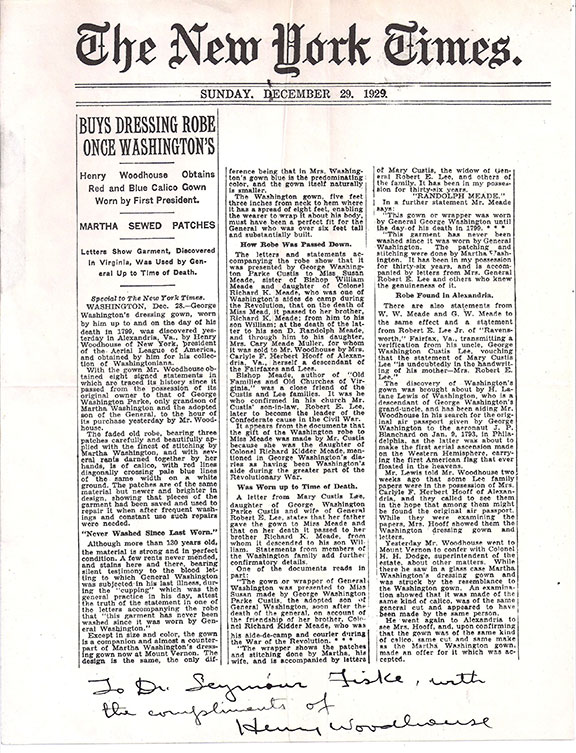 WOODHOUSE, Henry (1884-1970). Born in Italy, he came to the US and worked in a kitchen in Troy, NY. He killed the head chef with a knife, was arrested and sentenced to 4 years in prison. President of the Aerial League of America and also President of the Historic Arts Association. Known as the “Father of the Airport”, he was an early supporter of aviation and also supported the Polar Expeditions. He founded and published the magazine “Flying” (1912-1920). In 1928-30 he bought more than 1500 acres of land south of Washington, DC. Much of the land was ancestral lands of George Washington and George Mason. He planned to build a large Zeppelin airport on the grounds. Woodhouse collected items signed by famous people and donated many documents signed by George Washington to the Library of Congress. Later, he forged autographs however his works were far from perfect. Reproduction of a front page article from the New York Times, Dec. 29, 1929. Mr. Woodhouse was searching for the original air passport given by George Washington to the aeronaut J.P. Blanchard on Jan. 9, 1793. It was for the first aerial ascension made on the Western hemisphere and carrying the first American Flag that ever floated into the heavens. During his search he was able to discover and purchase Washington’s Gown which was worn by him till the time of his death. Inscribed and signed by Henry Woodhouse along the bottom margin. Woodhouse appears in a chapter of Charles Hamilton’s book “Great Forgers & Famous Fakes” (1980). A fine example of a very scarce signature, this is the first we have had handled..........$450.00 ![]() |