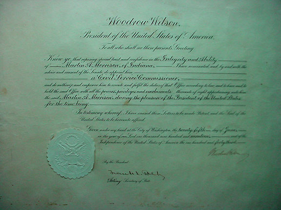 Wilson, Woodrow (1856-1924). 28th President of the United States (1913-1921). Awarded the Nobel Peace Prize in December 1920 as the leading architect behind the League of Nations and for his work ending WWI. Document signed, Washington, 25 June 1919, folio, appx. 18”x22”, appointment of Martin A. Morrison of Indiana a Civil Service Commissioner. Signed by Woodrow Wilson, as President and countersigned by Frank L. Polk, Acting Secretary of State. Polk represented the United States at the Peace Conference. In very good condition with large wafer seal attached. Affixed to a mat board. Signature of Wilson is nice and dark...$550.00