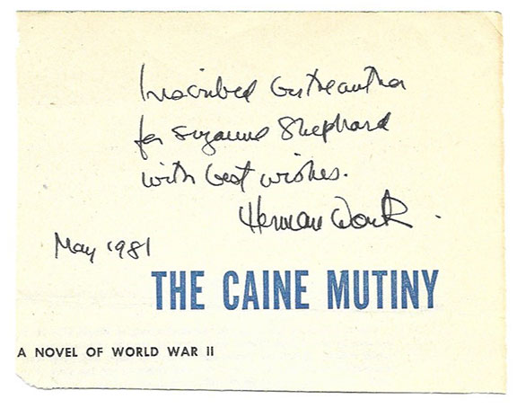 WOUK, Herman  (1915-(2019).  Jewish American writer. Best known for “The Caine Mutiny” which won the Pulitzer Prize (1951). He also is noted for “Aurora Dawn” (1947) and “The Winds of War” (1971).  Portion of the half title page from “The Caine Mutiny” which won the 1951 Pulitzer Prize. Inscribed, signed and dated in his hand May 1981. Not common in this format and perfect for framing...