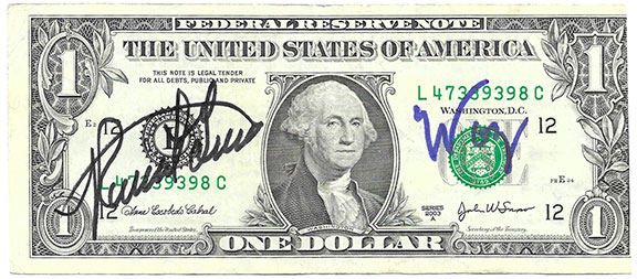 WAYNE, Ronald (1934- ) American technologist, one of the three co-founders of Apple Inc. along with Steve Jobs and Steve Wozniak. He is often referred to by the media as “The Forgotten Founder of Apple.” Wayne penned the founding contract as well as the company’s original logo-now a worldwide icon. In addition he created the first Apple Operations Manual. Wayne claims that Steve Jobs skillfully swindled him out of his 10% share of the enterprise. The original contract signed by all three co-founders sold in 2011 for 1.6M dollars. It is expected to be sold at Christies Auction in January 2026 and expected to sell for 2-4M dollars. U.S. $1 Federal Reserve Note boldly hand signed by Wozniak and Ronald Wayne. In fine condition.............$175.00
