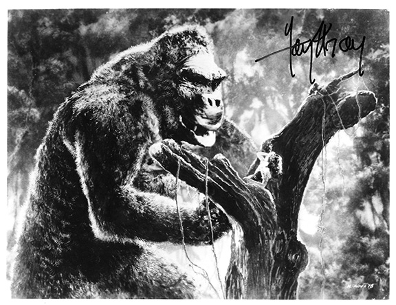 WRAY, Fay  (1907-2004).  Canadian-American actress most noted for the female lead in “King Kong” (1933).  She was one of motion pictures first “scream queens”.  Her career spanned 57 years.  Fabulous glossy photo, 8”x10”, B&W of King Kong reaching for Fay Wray. Boldly signed “Fay Ray”. In fine condition....................................................
