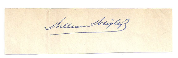 WRIGLEY, Jr. William (1861-1932). American businessman, who began his own business in 1891 manufacturing and selling soap and baking powder. He eventually abandoned the soap business and concentrated on selling chewing gum. During 1899 he announced a new flavor "Spearmint" which was an immediate success and brought in a million dollars worth of sales in 1908. In 1920, he bought the Chicago Cubs. In 1926, he renamed Cubs Park to Wrigley Field. A very RARE full ink signature “William Wrigley” on a slip with ample margins for matting and framing. Signatures of Wrigley are very scarce but full signatures can be considered RARE.................SOLD