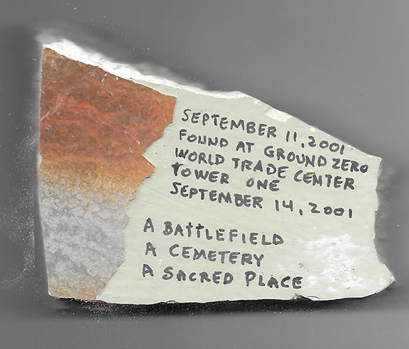 WORLD TRADE CENTER, TOWER NUMBER ONE, NEW YORK CITY (1971-Sept.11, 2001). Chunk of the World Ttrade Center, Tower #1, appears to be a cinder block with the face covered in cement, measures appx 3”x2”x1” and left side is painted. Weight 63 grams. Written on the front side: “September 11, 2001, Found at Ground Zero, World Trade Center, Tower One, September 14, 2001. A Battlefield, A Cemetery, A Sacred Place.” A fabulous collectible of American history and well suited for a small showcase........................SOLD