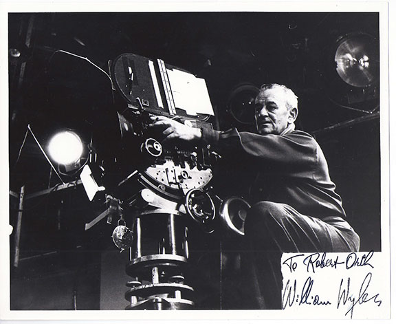 WYLER, William (1902-1981). Popular motion picture director. Three time Academy Award winner for Best Picture. Photograph, 8”x10”, B&W, of the Director behind his motion picture camera. Inscribed and signed: “To Robert Orth, William Wyler”. Robert Orth was Curator of Mid-American Film Archives. Signed photographs of William Wyler are not common................ $175.00 |
