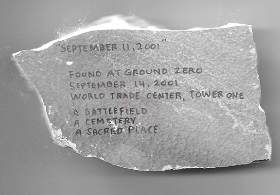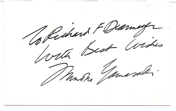 YAMASAKI, Minoru (1916-1986). Great world club architect. Creator of the New York World Trade Center. He studied more than 100 models before adopting the twin tower plan. Tower #1 completed in 1972 and Tower #2 completed in 1973. He built the two 110 story buildings but lost 400 million dollars in the construction. He was head of Minoru Yamasaki Associates. The twin towers were destroyed by terrorists on Tuesday, September 11, 2001. Both towers were hit by airplanes. This was the worst attack on American soil since Pearl Harbor. On unlined 3”x5” card the architect has written: “To Richard F. Dearmeyer with best wishes Minoru Yamasaki.” In very fine condition. Together with the signature comes a chunk of Tower #1 obtained on Sept. 14, 2011. Measures appx. 2.5”x5”................SOLD