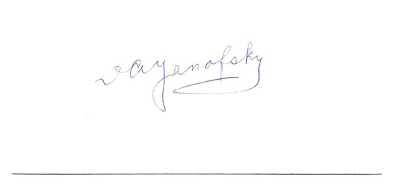 YANOFSKY, Daniel (1925-2000). Canada’ first Chess Grand master. Eight time Canadian Chess Champion. Born to a Jewish family in Poland. He won his first Canadian Chess Championship in 1941 at the age of sixteen. He became the first grand master raised in the British Commonwealth. He appeared in eleven Olympiads. Wonderful signature “D.A. Yanofsky” on a 3”x6” card........$45.00![]() |